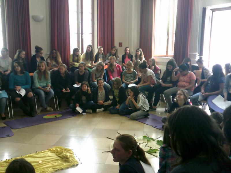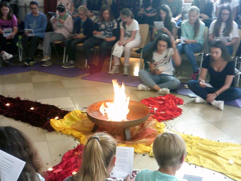 "Feuer und Flamme" waren unsere 6.Klassen einen Tag nach den Pfingstferien. Betreut von Mädchen aus der 8.Klasse beschäftigten sich die Schülerinnen in Gruppen intensiv mit der Pfingstperikope und setzten sie kreativ um: Ein Schatten-sowie ein Rollenspiel, ein Comic, eine Collage sowie die ganze Erzählung als Tagesschau gestaltet wurden am Vormittag erarbeitet und bildeten das Zentrum des Gottesdienstes, den Pfarrer Zitzler mit uns gestaltete.