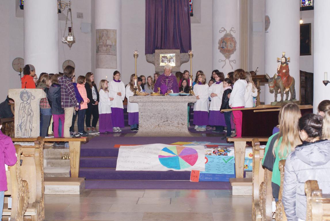 Jede Klasse machte sich vier Wochen lang Gedanken über unseren Umgang mit Konsum, Essen und dem Leben in anderen Ländern, die nicht so reich sind wie wir. So wurden z.B. Teller gestaltet, auf denen man Essgewohnheiten hier und anderswo vergleichen konnte, Umfragen auf dem Markt durchgeführt oder Kochbücher mit fair gehandelten Produkten zusammengestellt, denn im Segensgebet der diesjährigen MISEREOR-Fastenaktion heißt es: