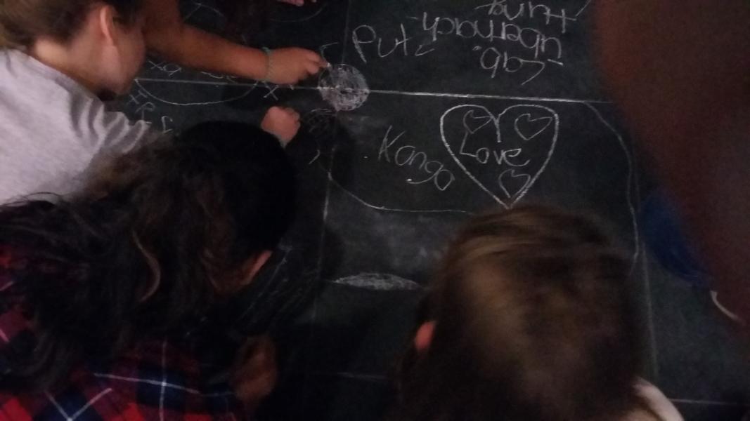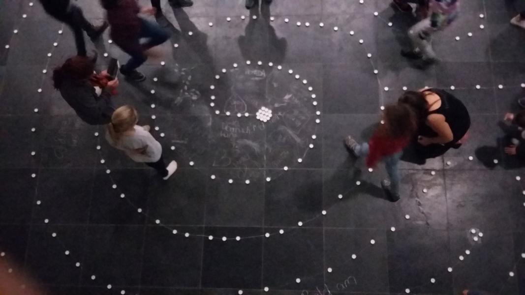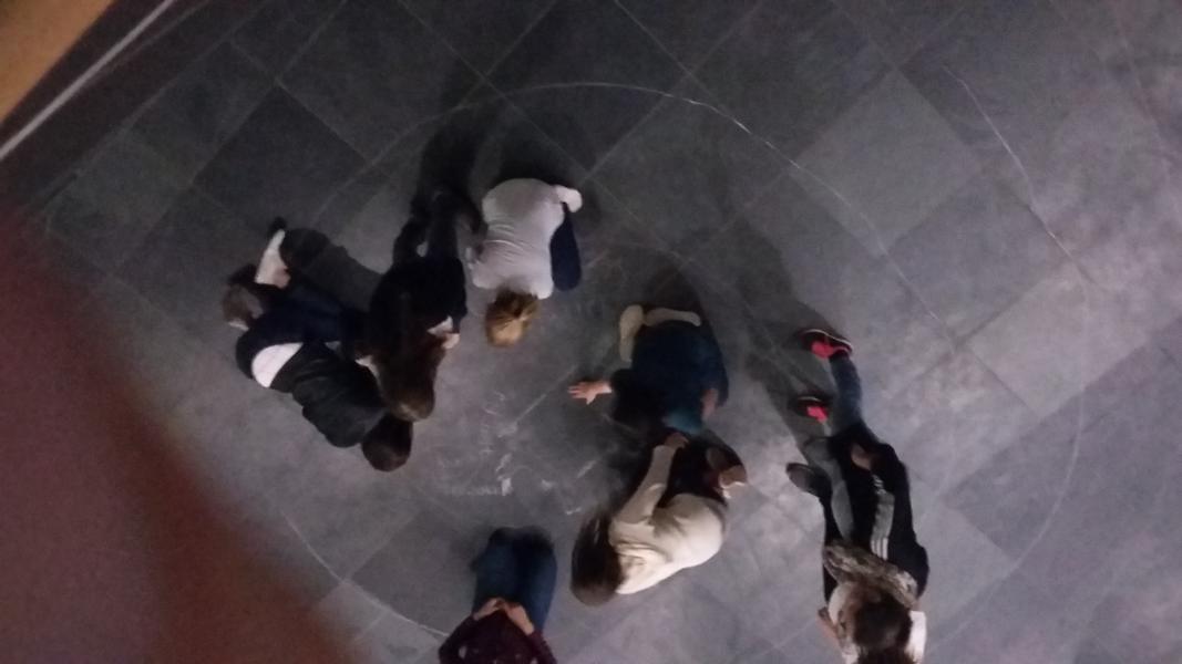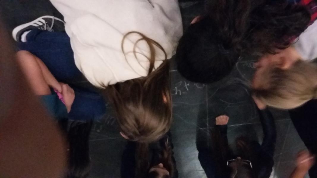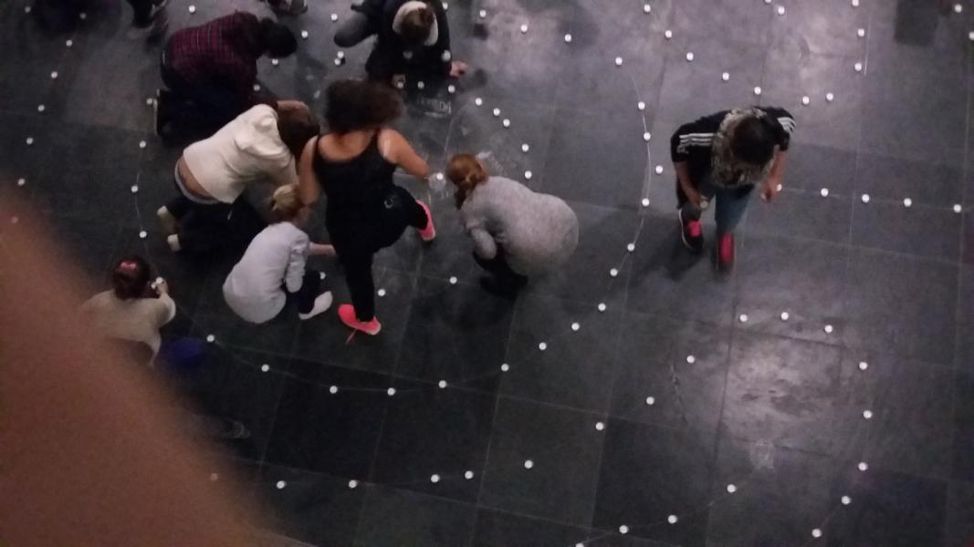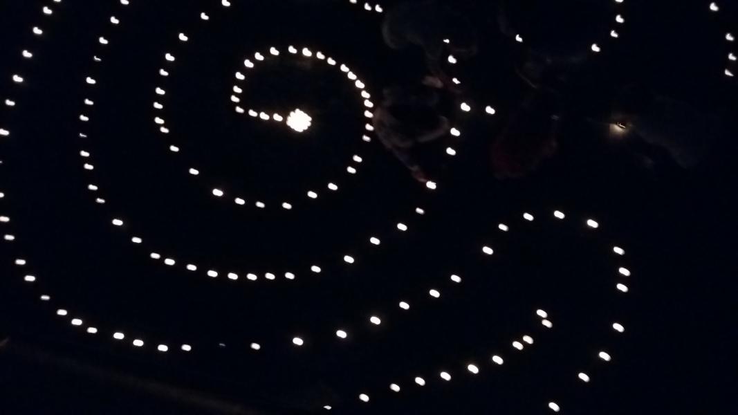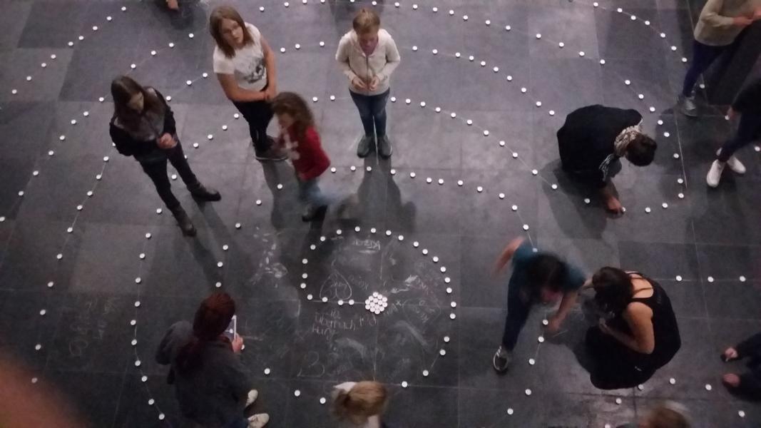 Nach dem Herrichten des Musiksaals für die Übernachtung ging es daran, ein eigenes Labyrinth im Schulhaus zu bauen. Nach einer kurzen Einübung in die Konstruktion eines Labyrinths waren die Mädchen in der Lage, selbstständig das Labyrinth in der Aula aufzuzeichnen und dann mit Hilfe von 398 Teelichtern zum Leuchten zu bringen.