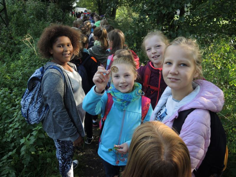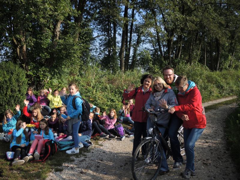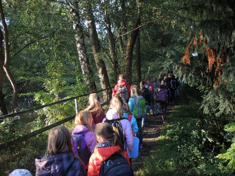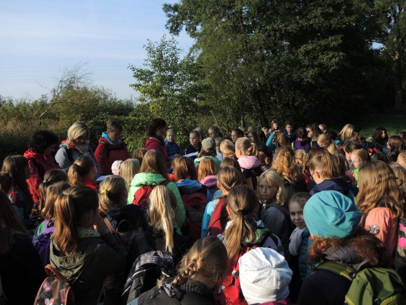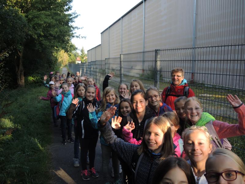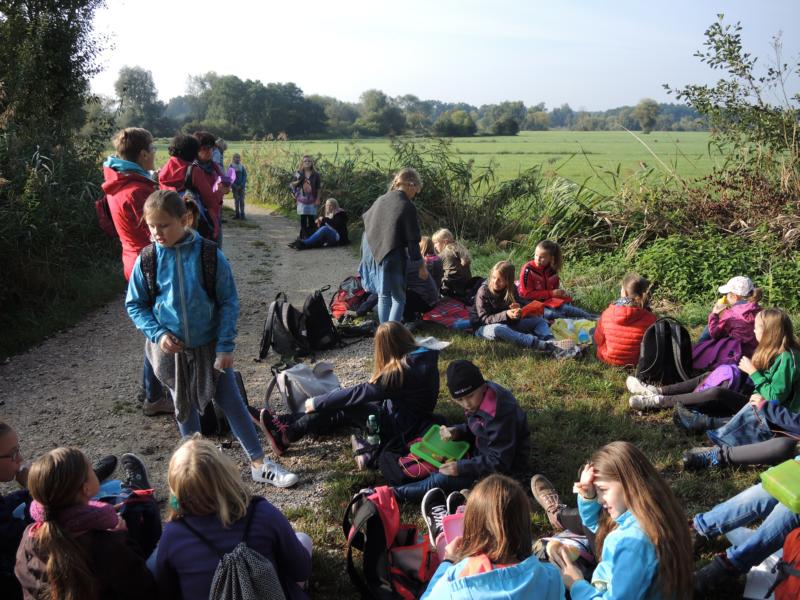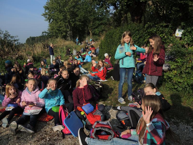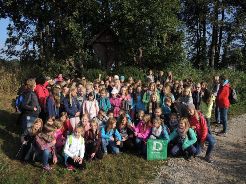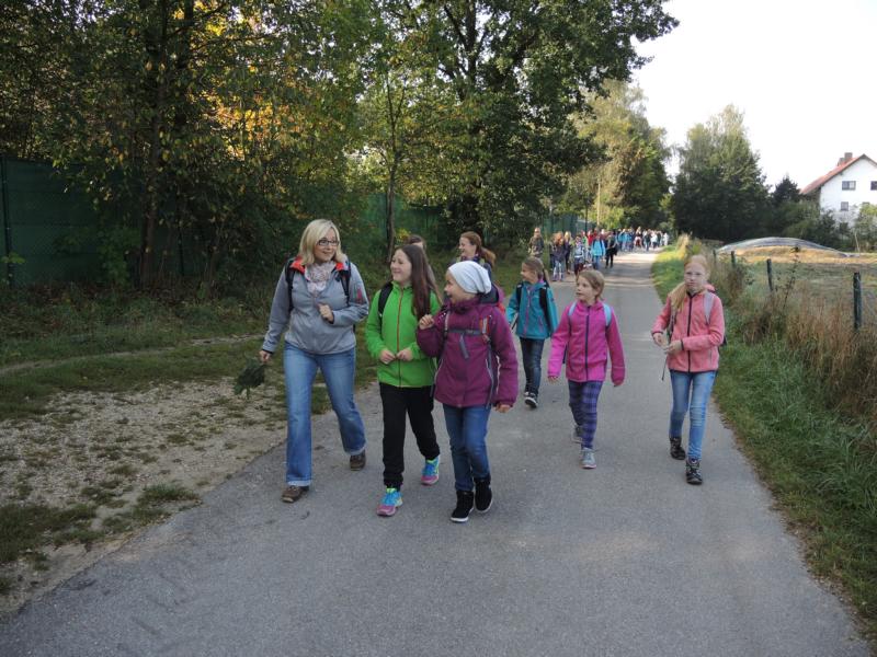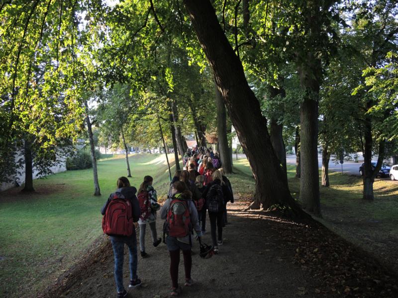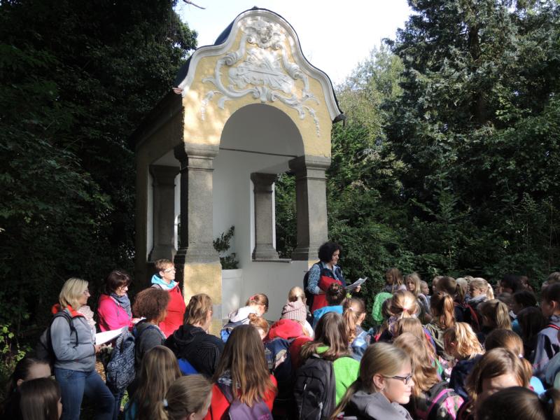 Pilgertag der der 5. Klassen23. September 2016Damit sich die einzelnen Gruppen besser kennenlernen, machten sich alle 5. Klassen in der zweiten Schulwoche mit ihren Klassenlehrern sowie Ulrike Sperrer von der Mittagsbetreuung auf einen ganz besonderen Weg – einen Pilgerweg. Über den Stadtwall und die Schulturnhalle gelangten wir auf verschlungene Pfade an der Paar entlang. Dort fanden die Kinder auch sogleich das Schild, das den Weg als Teil des „Jakobus-Pilgerwegs“ bezeichnet. An zwei Stationen hörten wir Gedanken zur Natur, unserem Leben und dem Weg, auf dem es vieles zu entdecken gab. Der Rückweg führte zu einer kleinen Überraschung: Auf dem Parkplatz hinter dem Finanzamt steht eine Kapelle, die den Maria-Ward-Schwestern gehörte. Dort hörten die Mädchen von Mose, der sein Ziel - das verheißenen Land – zwar noch sehen durfte, es jedoch niemals erreichte. Nicht an jedem Lebensziel kommt man an, dennoch ist es wichtig, immer wieder aufzubrechen, denn der Weg ist oftmals das eigentliche Ziel. Mit diesen Gedanken erreichte die Gruppe die letzte Station, den Anfangsgottesdienst der Jahrgangsstufe in der Frauenkirche. Ein bewegter, mal nachdenklicher, mal lustiger Pilgerweg fand in der Schulmensa bei einem gemeinsamen Mittagessen seinen Abschluss. „Ich glaub, heute Nachmittag gehe ich mit meiner Familie den Weg nochmal ab, damit die ihn auch sehen!“, lautete der Beschluss vieler begeisterter Fünftklässlerinnen. |