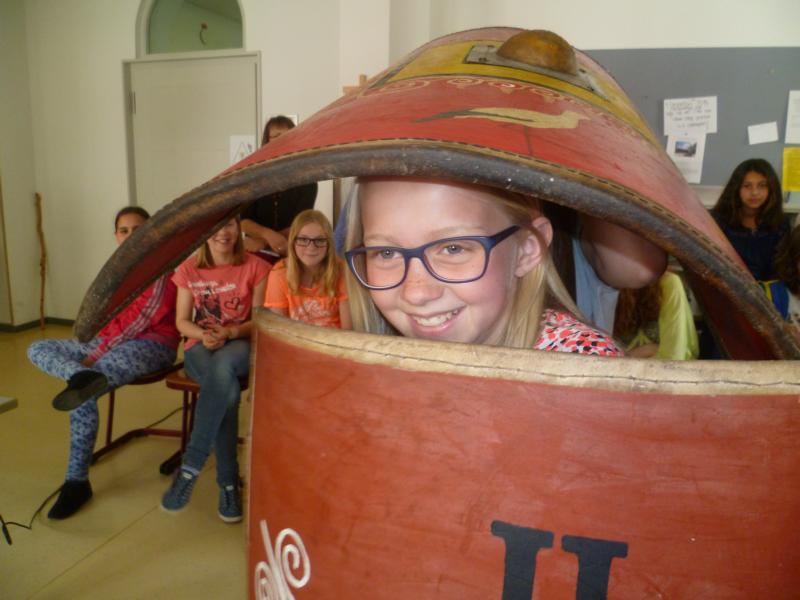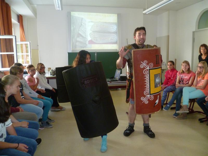 Am 22.6.2015 war ein Legionär an unserer Schule zu Gast! Josef Geisberger, der aus Regensburg stammt, beschäftigt sich mit "Experimenteller Archäologie", ein Projekt von der Universität Regensburg. Zusammen mit einer Römerin gab er unseren Mädchen der 6.Klasse einen Einblick, wie ein Legionär in der Römerzeit so lebte. Begeistert waren die Schülerinnen nicht nur von seinem Vortrag, sondern auch von den vielen Gegenständen, die sie sehen und benutzen durften. So konnten sie ein Kettenhemd anprobieren, sich mit einem Römischen Schild in Kampfhaltung begeben oder die Schuhe eines Legionärs näher betrachten!